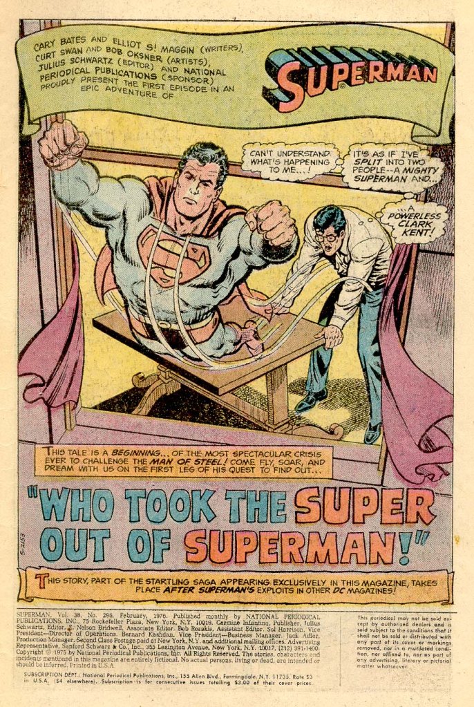 The other thing that might have motivated me in buying these two issues is that the story was a four-parter, which was an epic by the DC standards of the period. As such, it seemed like it was somehow an important story to me–and that impression was magnified by the fact that it took two Superman writers to tell it–Cary Bates and Elliot S! Maggin collaborated on this series. I was familiar with the both of them, some of the very few comic book creators that I knew and paid attention to, largely from their appearances as characters in FLASH and JUSTICE LEAGUE OF AMERICA.