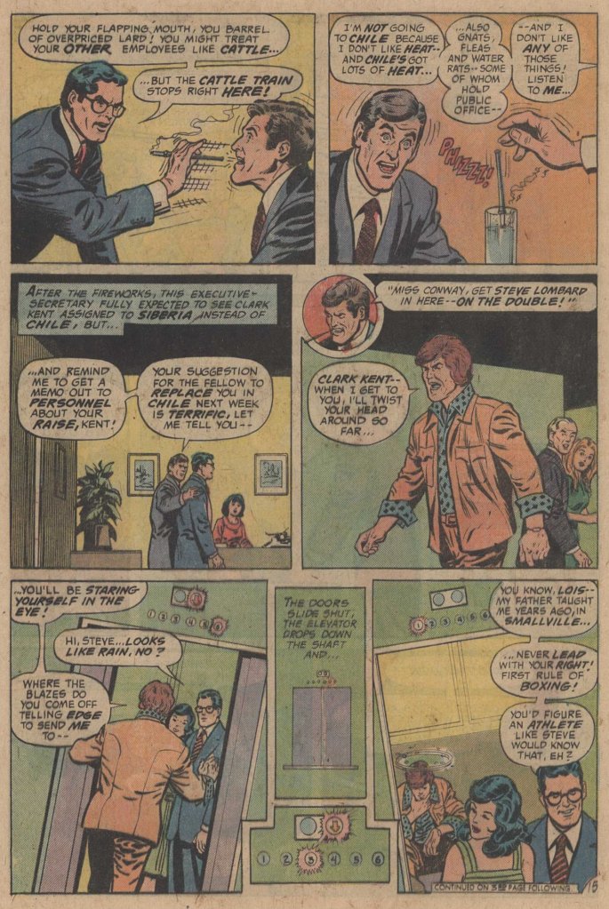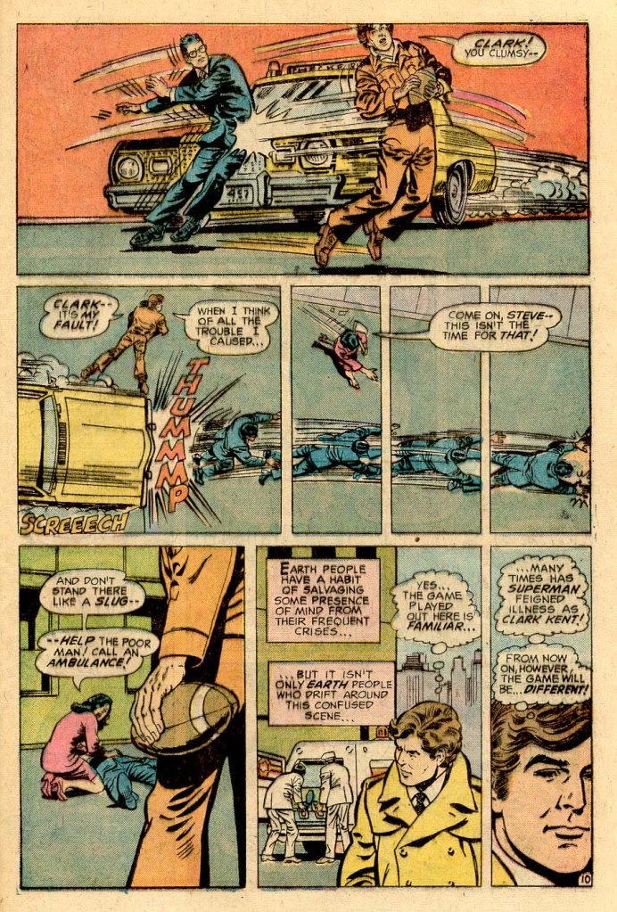 I didn’t realize at the time that this storyline had in part been conceived to pay off on a long-running mystery concerning Mr. Xavier, a reclusive and secretive tenant in Clark Kent’s apartment building, who had been referenced a few times in the past. Here, we see him arrive on Earth the same day as Kal-El’s rocketship, having been dispatched by his far-off homeworld to shadow and ultimately neutralize the Kryptonian now living on Earth. In the present, after a brief-if-colorful exploit, Superman goes to meet Lois Lane and Steve Lombard for some sparring. He removes his costume before changing to Clark Kent as he knows he’s going to have to change into workout gear shortly. When Lombard is about to be struck by a cab, Clark intervenes–but he himself is flattened by the automobile.