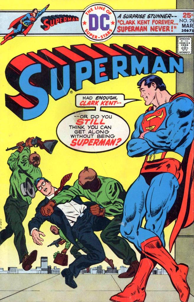 To provide for some more action, Superman is almost killed by an assassination robot sent to rub out Clark Kent–he is barely able to get his last shoe off in time. He thinks his problems are somehow psychosomatic, the result of leading a double life all these years (he comes to this conclusion without any examinations or tests, which seems nuts, but in the 70s we just rolled with concepts such as this one.) So Clark has determined that he needs to adopt one of his two lives permanently. Meanwhile Mr. Xavier, who is mysteriously responsible for this turn of events, gets his final instructions from his homeworld: they’ve been contracted to destroy the Earth (by who and why is never brought up) and Xavier is to use Superman to do so. And that’s where #296 ends.