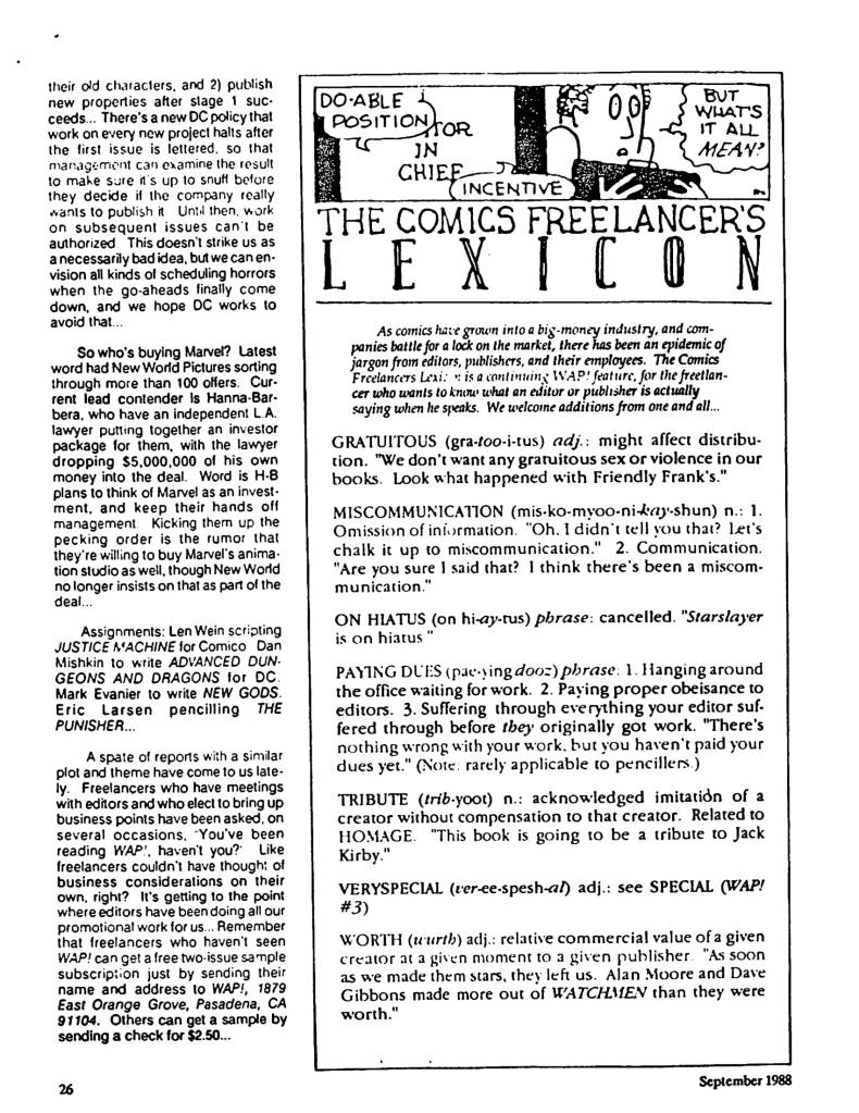 WAP – Words and Pictures #6 Tom Brevoort Classic Fanzines December 21, 2019July 3, 2021 The sixth issue of the freelancer newsletter published by Steve Gerber, Steven Grant and Frank Miller in 1988. Share this: Click to share on X (Opens in new window) X Click to share on Facebook (Opens in new window) Facebook Click to share on Reddit (Opens in new window) Reddit Click to share on Tumblr (Opens in new window) Tumblr Click to email a link to a friend (Opens in new window) Email Like Loading... Related Published December 21, 2019July 3, 2021