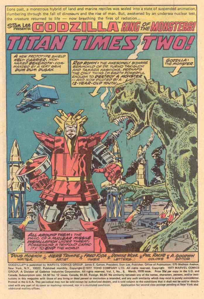 Oh, the story? SHIELD’s trying to prevent Godzilla from crashing through a nuclear missile base, and are aided in these efforts by Red Ronin, who has been shanghaied by Rob Takigushi. Rob feels that Godzilla isn’t a threat, and he wants to save the big lizard from SHIELD while also safeguarding everybody else. But Rob doesn’t really know how to control Red Ronin well, so a bunch of fighting breaks out. Eventually, though, Rob succeeds–and as Dum Dum fumes, Godzilla walks off into the sunset and into the next issue.