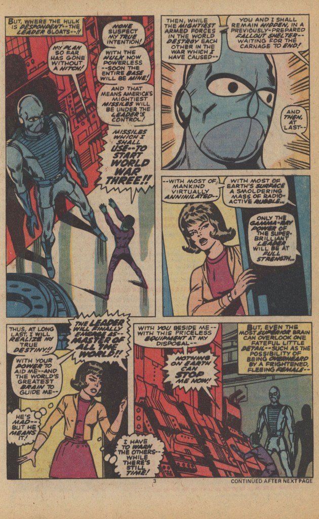 But the Leader can’t stop himself from spilling his plan to his unresponsive Humanoid, and so Betty Ross overhears what he’s got cooking. She seeks out Major Talbot, and the two of them determine that the only course of action is to release the Hulk to defeat the Leader. Unfortunately, Talbot doesn’t have the rank to get the job done, so instead he takes over the base’s P.A. system and issues an order to capture and detain the Leader and his android, even though he has no authority to do so.