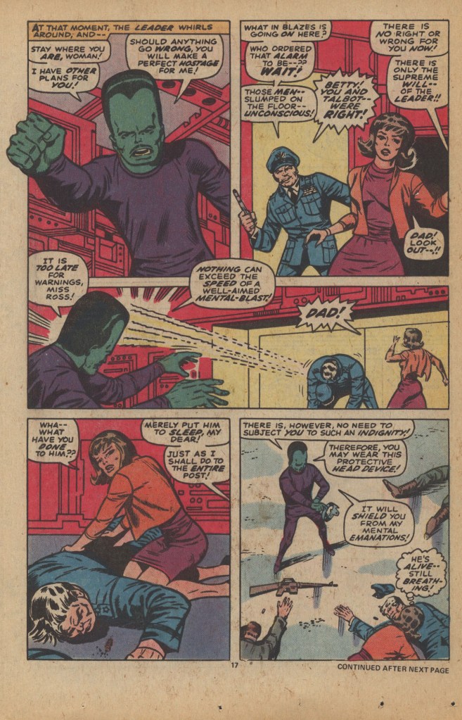 But this is too little too late, as the Leader and the Humanoid have little difficulty in mopping the floor with the crack troops that show up in response to the alert. T-Bolt Ross sows up too, pissed off and wanting to know what’s going on, but the leader simply mind-blasts him. But perhaps needing an audience, he gives Betty Ross a headpiece that will shield her from the mesmerizing effect that he sets off across the base, putting all of its defenders to sleep.