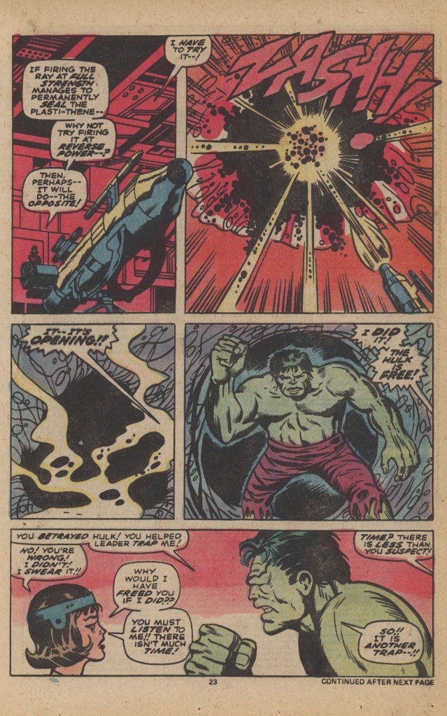 And so, the Leader commits super villain mistake number one, for as soon as his back is turned, Betty makes for the area where the Hulk is trapped within the plasti-thene globe and is able to reverse the weapon that created it, thus freeing the Hulk. The simple-minded Hulk isn’t sure what to make of this–last issue, Betty helped the Leader and the army to trap him. But old jade jaws always was a sucker for a pretty face, and so it’s only a few panels before the stakes are the Hulk and Betty against the Leader, his Humanoid and the entire mesmerized base.