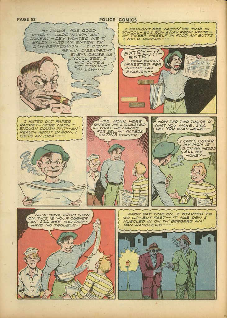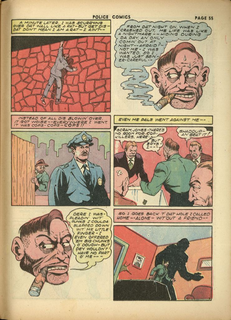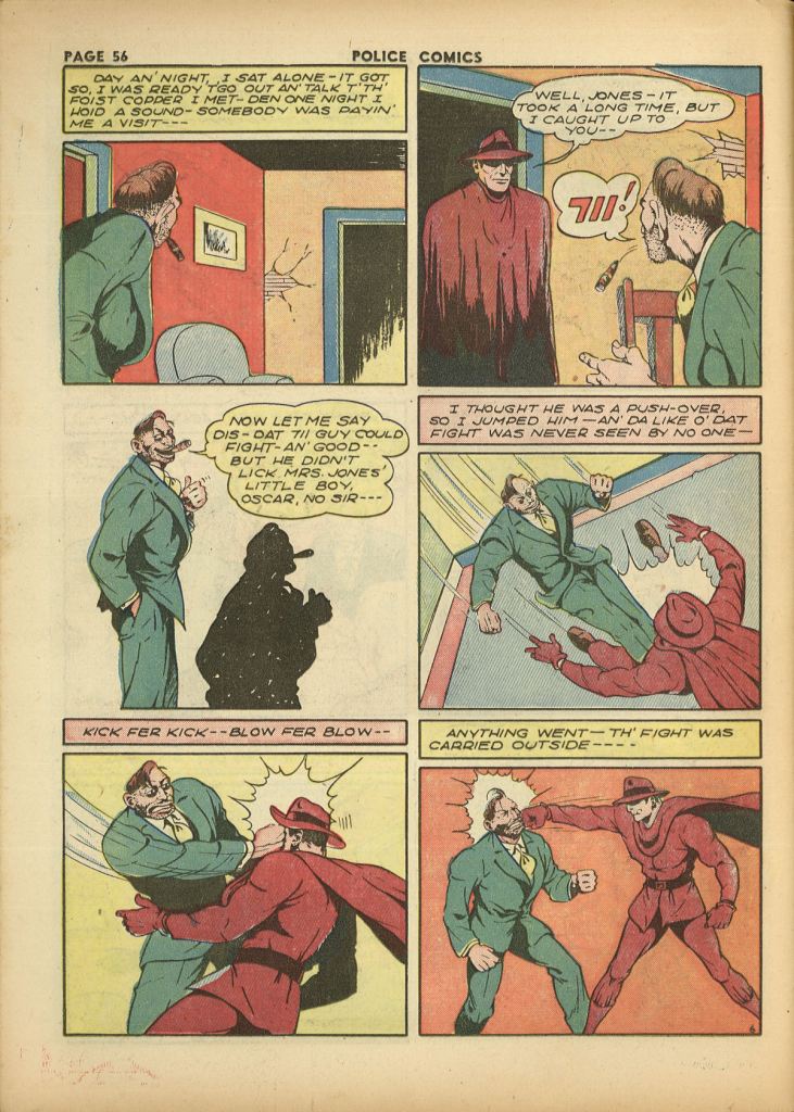 It was a second banana strip that did second banana business. Entertaining enough, but not especially memorable. It began in the first issue of POLICE COMICS, but moving into the title’s second year, somebody clearly thought that it wasn’t pulling its weight.