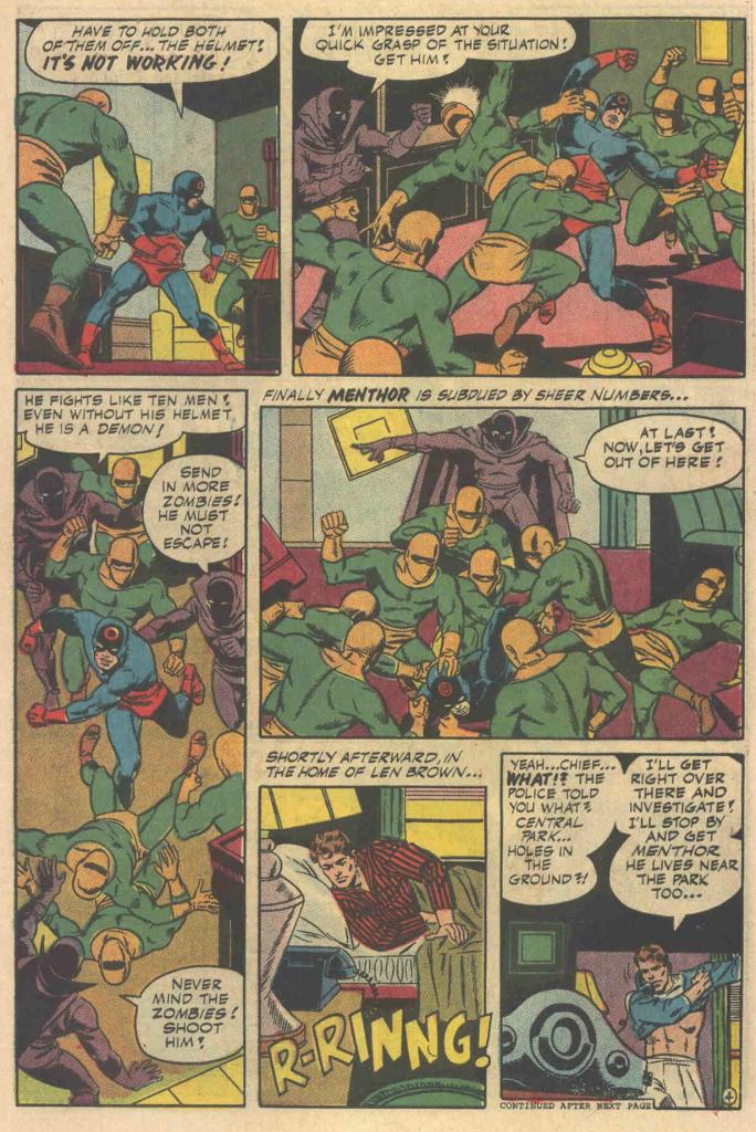 This final Menthor story was scripted and broken down by Dan Adkins. Steve Ditko provided the full pencils and Wally Wood inked it–his powerful style making everything seem like his work, though there are hints of Ditko’s contributions in some of the compositions.
