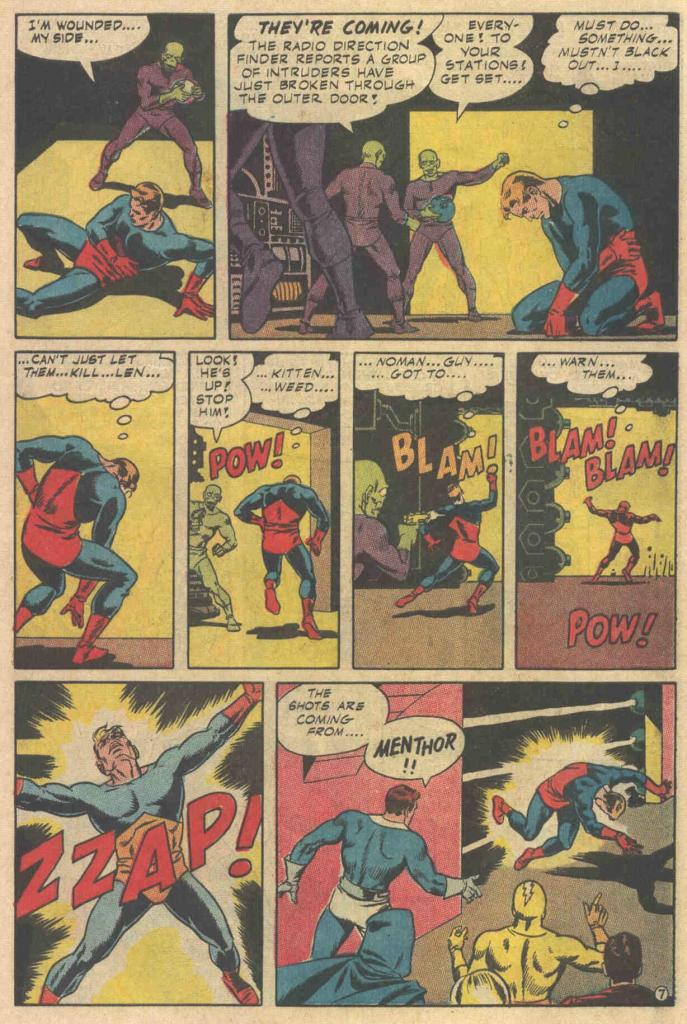 But before that, we got the death of Menthor in THUNDER Agents #7 in 1966, an unheralded and unexpected death story that both turned out to be permanent and which was also affecting. Given the spy mileau background of THUNDER Agents, it was also fitting that somebody was going to die along the way (the series had killed Egghead, one of the THUNDER Squad, early on, but that seemed more like bringing the number of characters in that strip down to a workable level.)