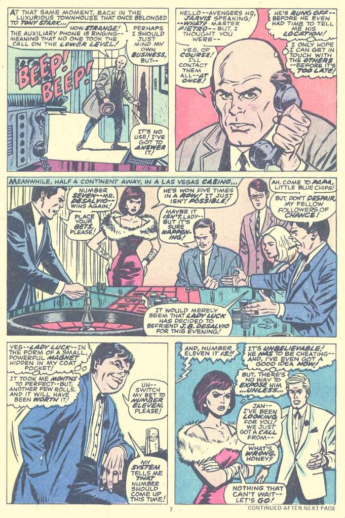 The story opens with Quicksilver and the Scarlet Witch the prisoners of Magneto and the Toad, who want them to rejoin the Brotherhood of Evil Mutants. Their recruitment methods leave a little bit to be desired as they’ve got Wanda and Pietro chained up in a makeshift dungeon. Maybe this was a brotherhood hazing, I don’t know. Either way, Quicksilver is able to free a hand and get to his Avengers mini radio to send an SOS. We ten cut around to see where the assorted individual Avengers are, including Goliath and the Wasp, who are in las Vegas. There’s a strange dogleg page that goes nowhere setting up a gambler who’s cheating using magnets concealed in his pockets. It wasn’t until years later that I’d get to read the page that was cut out of this reprint where the tiny Goliath and the Wasp expose this guy and get him kicked out. So it’s a strange beat here.