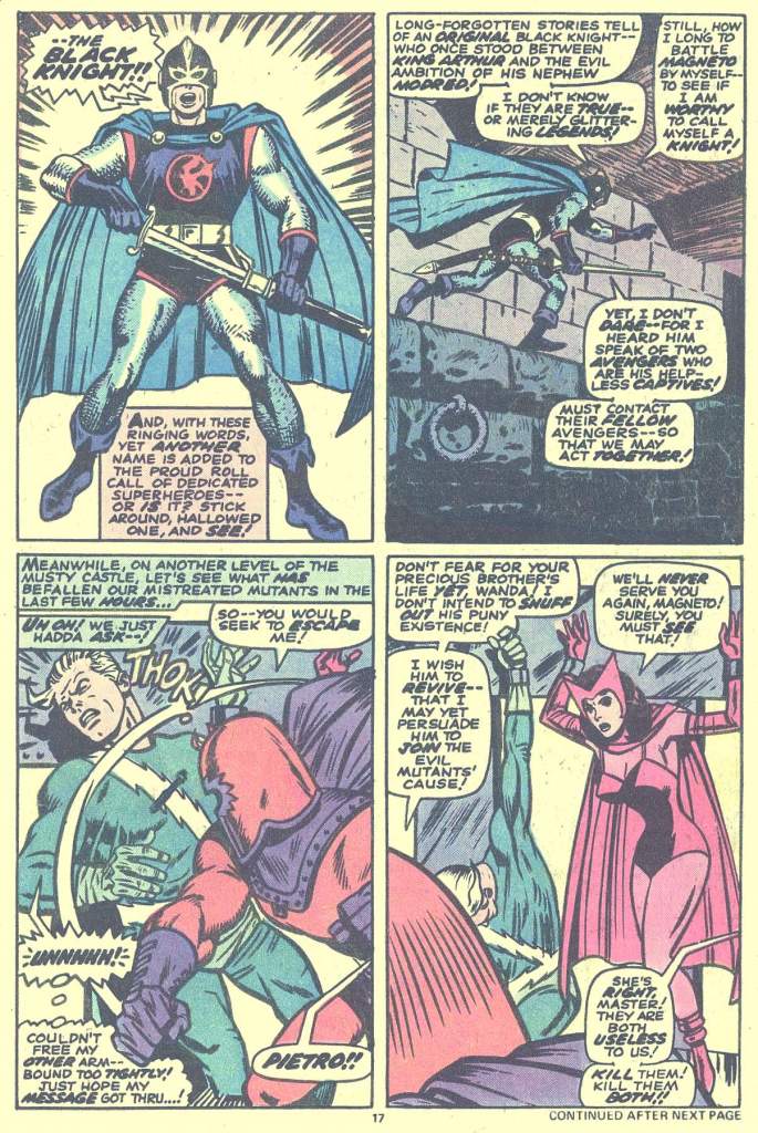 As the Avengers begin to assemble, back at Garrett Castle where Wanda and Pietro are being held, another figure works his way through labyrinthine secret chambers. This is Dane Whitman, the scientist who created the magnetic bridge which allowed Magneto and the Toad to get back to Earth. But there’s more going on with Whitman than that–he’s actually the nephew of the super-villain called the Black Knight, who had perished in battle with Iron Man some time earlier. Dane ad promised his dying Uncle that he would redeem the family name by using his science in the service of mankind.