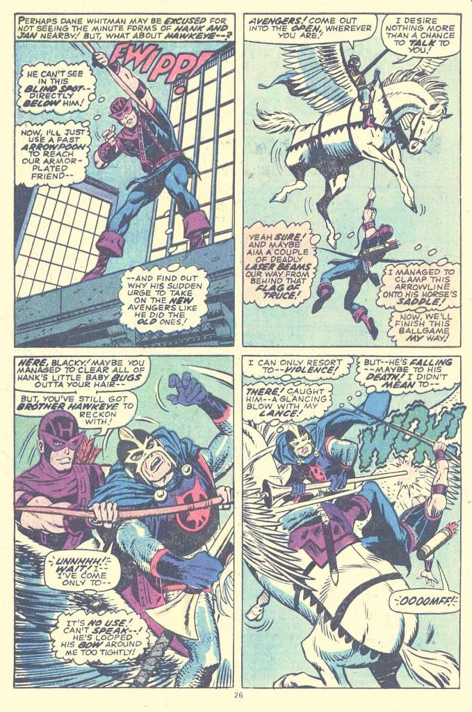 In typical Marvel fashion, its a big ol’ colorful fight sequence, with the Avengers not giving the Black Knight time to explain himself and the Knight’s inexperience putting the various Avengers and the rubberneckers gathered below at risk several times. In the end, the Knight accidentally uses too much power when blasting a building cornice, causing it to crumble and fall towards the ground. Goliath grows large enough to catch it and hurl it away, but he’s left off-balance by the maneuver and he himself falls towards the ground. Fortunately, he begins to shrink as he does so, allowing the Knight to catch the wayward Avenger on the back of his winged steed Aragorn.