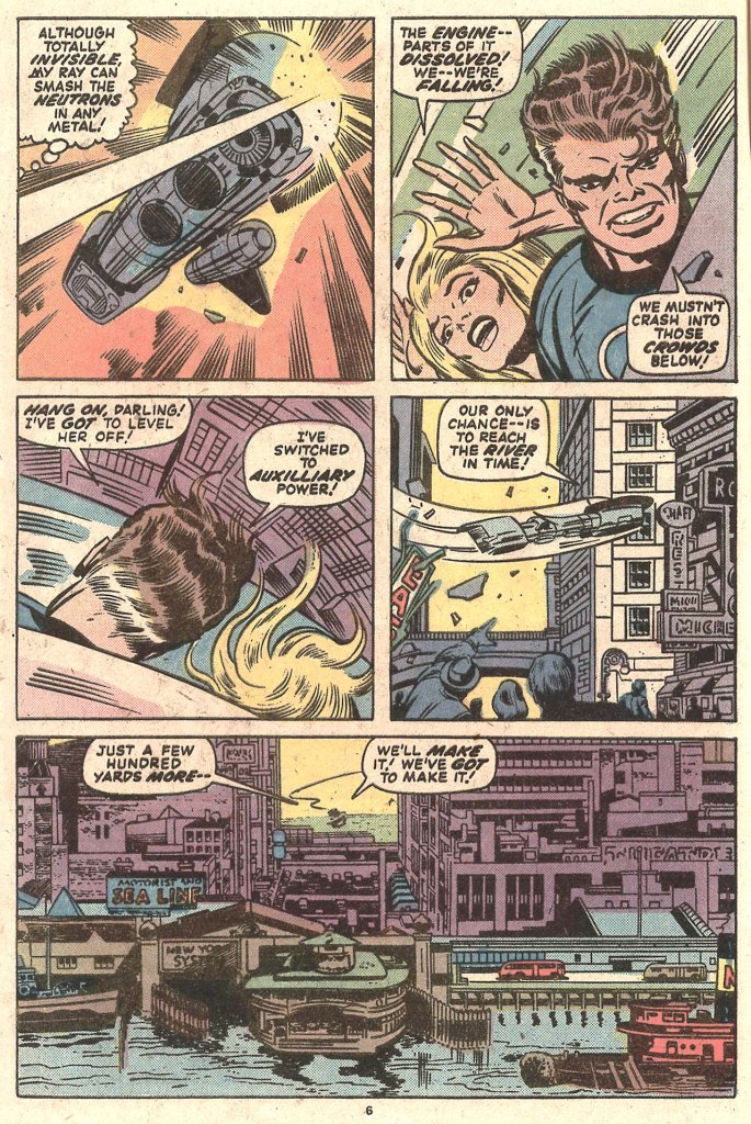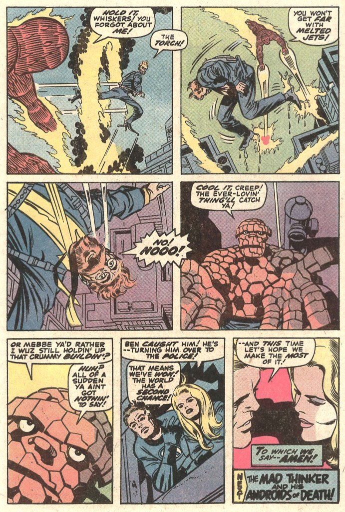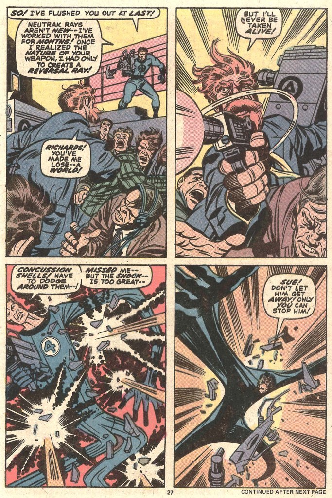 Back at the UN, the Monocle is at last ready to make his move. But as he pulls the trigger on his camera-weapon it blows up in his face! Reed is on scene, and having identified the energy that destroyed the Fantasticar, he’s come equipped with a device that would reverse it. Kirby’s mastery of pace and visual storytelling is on full display here. Look at the way he moves his camera in this four-panel sequence, the manner in which he conveys the movement of the monocle’s gun in Panel 2, or Reed’s movements in Panels 3-4. All four panels are the same size, yet there’s an energy and a thrust to the action due to how Kirby frames it. For all that the story is thing, there are pages in this issue and the ones surrounding it that are worth studying by anybody with an interest in comic book storytelling.