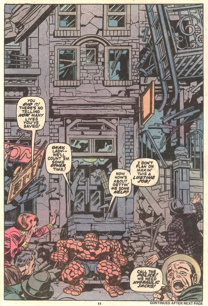 In an interview a couple of years ago Joe Sinnott mentioned that splash page of the Thing holding up the building. Considering he inked it almost half a century before, and he has worked on hundreds of stories over the decades, obviously it was dynamic enough to lodge itself in his memory.