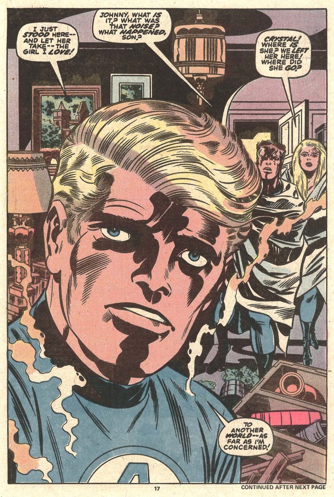 Meanwhile, back at the Baxter Building, the Human Torch is trying to prevent his girlfriend Crystal from heading back to the Inhumans’ Great Refuge with Medusa, who has come to retrieve her on behalf of Black Bolt. As impassioned as he gets, Johnny can’t dissuade Medusa form her mission or Crystal from her duty, and he’s sullenly forced to watch as the two ladies disappear. He’s still depressed when Reed and Sue get back in after having dunked the disabled Fantasticar in the river, and he flames out in search of their attacker, looking for some action to get his mind off of his troubles. Like the Thing before him, Johnny finds himself being diverted as different structures collapse all around him.