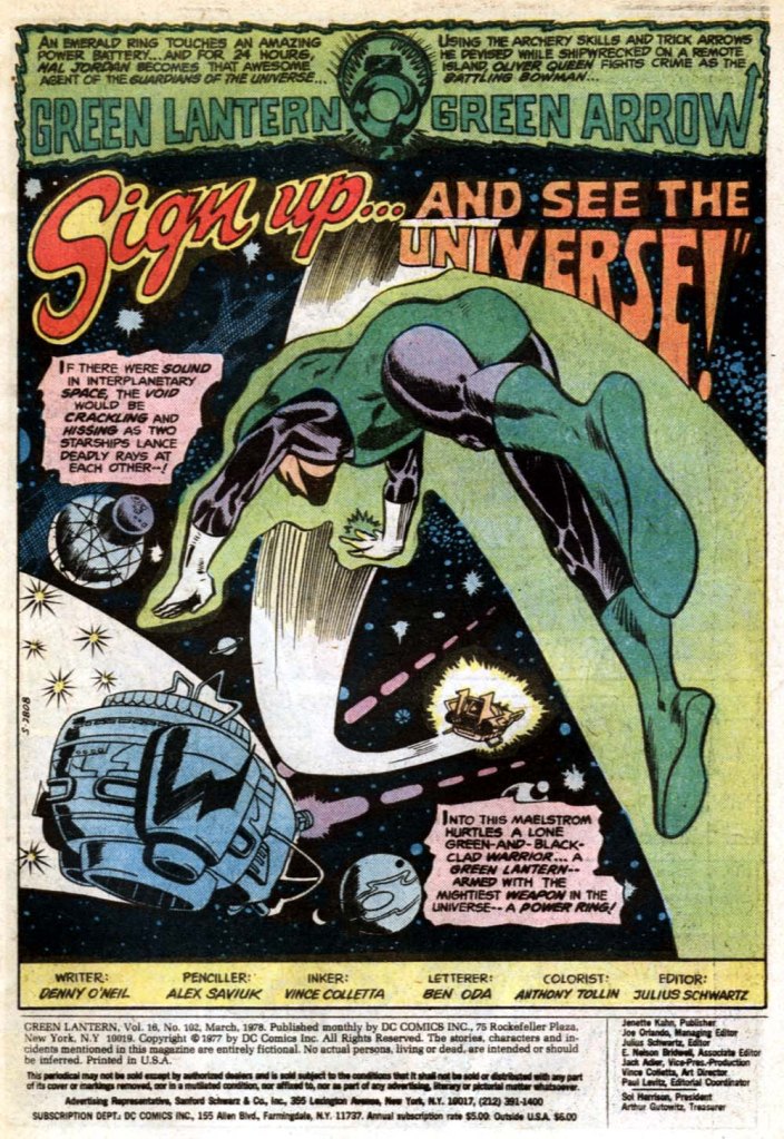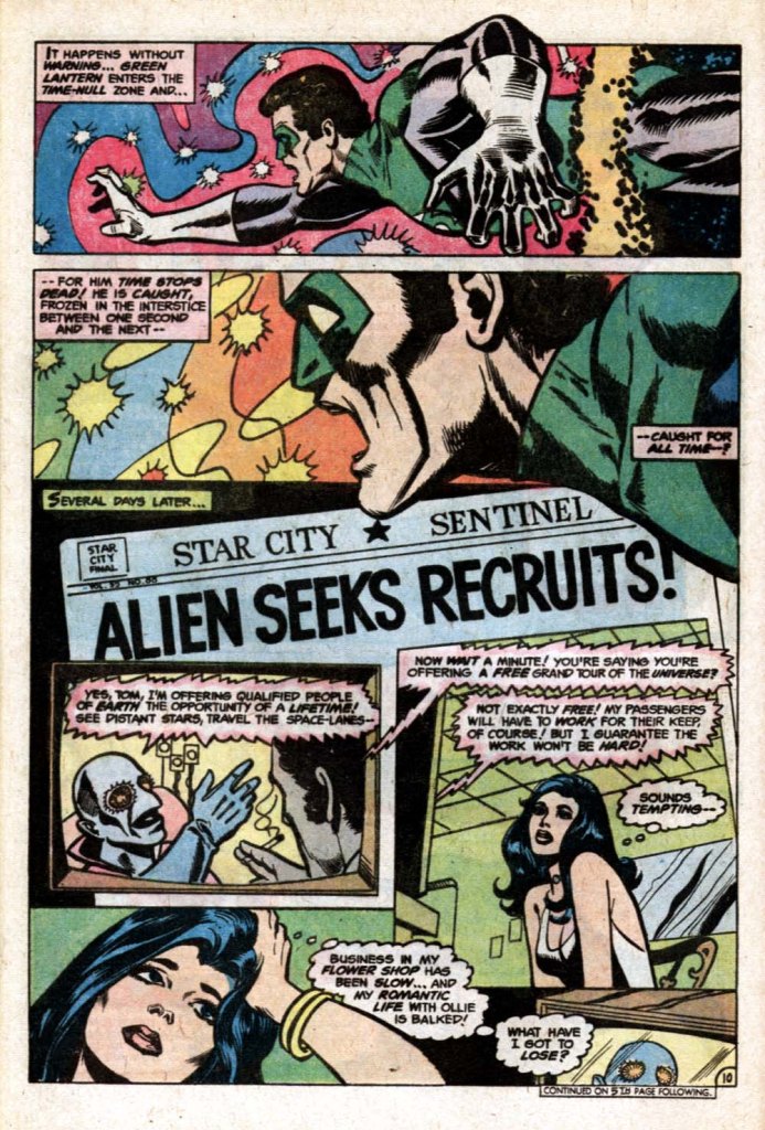 But that’s a bit of false drama, as GL recovers in a few seconds and heads off after the alien. meanwhile, on Oa, we learn that the Guardians have detected the formation of a Time-Null zone above Earth. This handy plot device is perilous, and they try to warn their Earthbound Green lantern about its presence. But the zone interferes with their communication–so as Hal tracks the alien into space, he gets trapped in the zone, frozen in a single instant of time. Meanwhile, Green Arrow’s relationship with Black Canary is on the rocks, and this has Dinah re-evaluating her life and er choices. So when the alien goes on television to offer crew positions on his starship, she decides to take him up on his offer.
