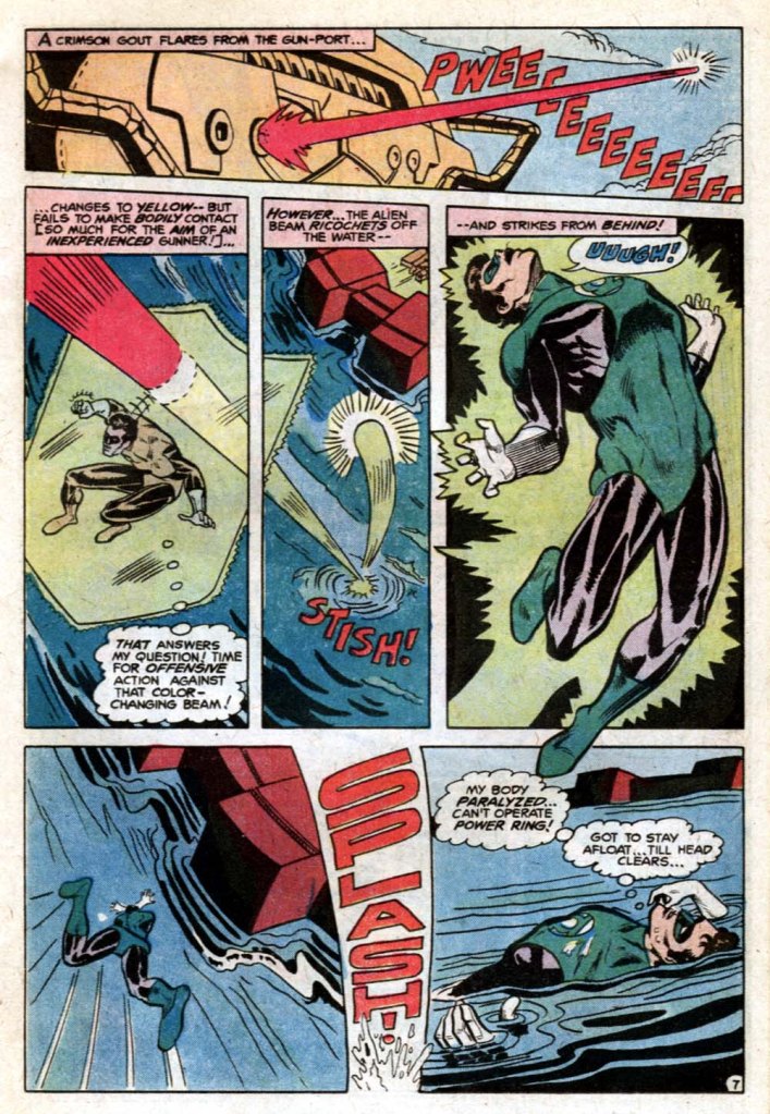 Fortunately, truck driver Hal Jordan happens to be in the area and he hears about the crippled dam over his CB radio. Becoming Green lantern, he races to the scene in time to shore up the dam and prevent a disaster. But upon seeing him, the surviving alien recognizes his uniform as that of a Green Lantern and opens fire on him. Much like his fellow ring-slinger before him, Hal is shot down by bolts his power ring is helpless to deflect, and while he isn’t instantly killed like his comrade was, he finds himself paralyzed and floating in the river, only minutes away from drowning.