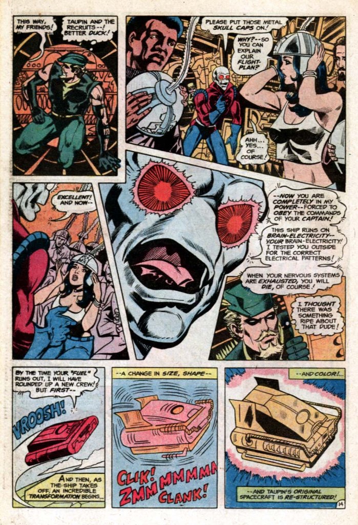 There’s a mental test tat all applicants need to take, but Dinah aces it easily. Ollie comes out to try to convince her to stay, but, failing that, he takes the test as well, but it’s a no-go. He’s not permitted to join the crew. Undaunted, he dons his green Arrow gear and makes his way aboard the ship as a stowaway, his instincts telling him that this all can’t be on the up-and-up. And it isn’t. The alien is using the brain-energy of his supposed crewmen as fuel for his vessel–they’re captives to be used up, not crew at all.