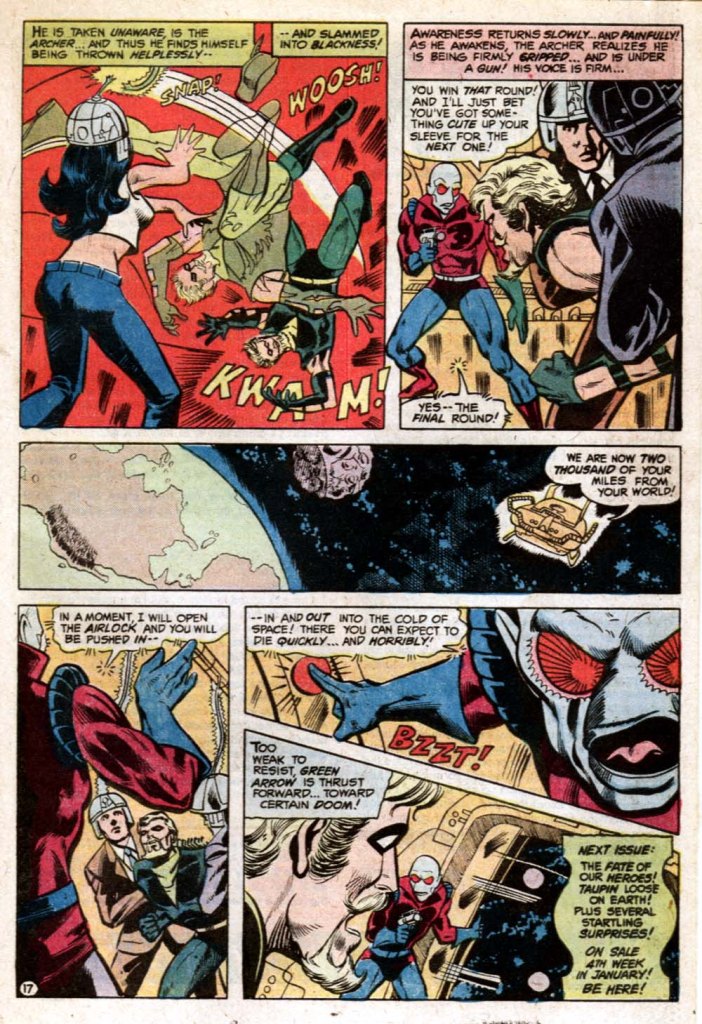 Green Arrow emerges from concealment and tries to put a stop to this. But while they’re wearing those brain helmets, the earthlings are all under the mental domination of the alien, and they swarm Green Arrow, overpowering him by seer numbers. Ollie can’t bring himself to even fight back against a mesmerized Dinah. And so, the alien opens an airlock, intending to have Green Arrow hurled out of the ship into the void of space–and there, in a tiny panel at the bottom of the page (and without Green Lantern even in evidence) we are To Be Continued. This makes me wonder whether this two-parter may have started life as a longer single-issue story and was broken in half in order to make it fit. No idea. But I can tell you that I thought this wrap-up to the issue was unsatisfying all around.