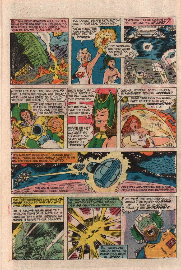 The Vanguards themselves are Celestra, who could transmute into a destructive energy form; Cerebra, the telepath and telekinetic; and Corona, who could surround herself with an aura of flame. Each one came from a different planet, Legion of Super-Heroes-style, and they were united in trying to overthrow the evil empire that had taken over their star system.