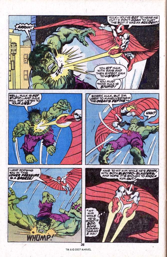 This leads, of course, to the proverbial big fight. I have to say, I liked Stingray–I liked his look. It is a bit odd to see him kind of flying around here, given that his outfit was designed to propel him through the water. But whatever. That manta ray-style cape-thing was pretty awesome, as was his faceless helmet. None of that, though, helps him against the Hulk, who proceeds to hand the aquatic do-gooder his head, smashing him to the ground and moving in to finish Stingray off for what the Hulk perceives as the murder of his friend Jim.