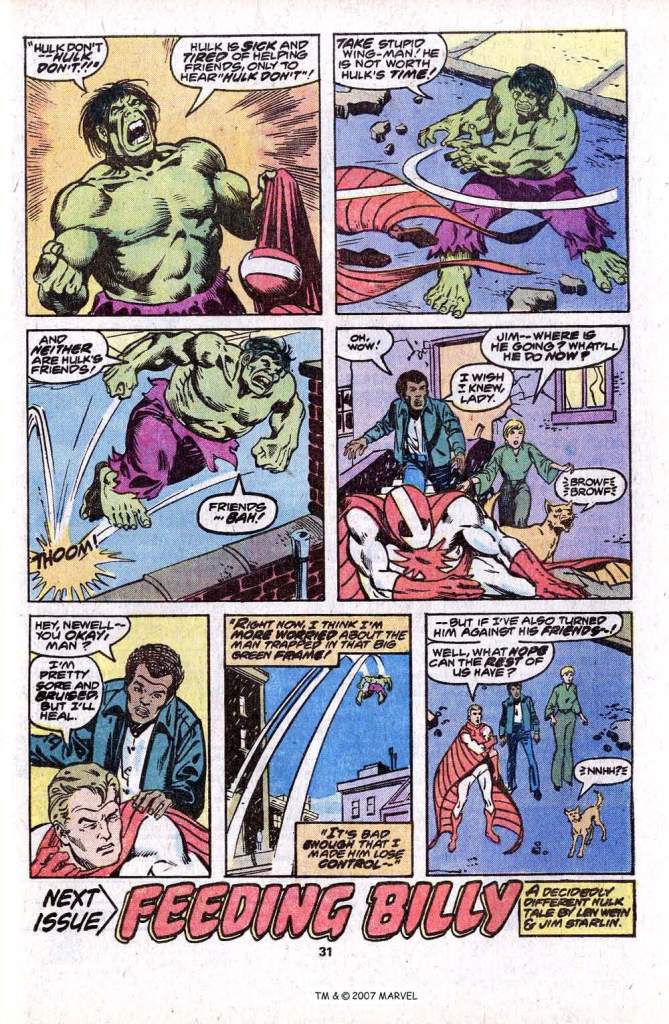 This issue picks up where the previous one left off, in true Marvel style. Bruce banner had just been rescued after his Robinson Crusoe adventure at sea–and it turns out that the ship that’s picked him up is commanded by Dr. Walter Newell, a character from old issues of SUB-MARINER better known as Stingray. Banner conceals his true identity from Newell during teh journey home, but upon making landfall, Newell learns it from a handy newspaper article, and kicks himself for having accidentally unleashed the Hulk back into the population. meanwhile, Banner has headed home, there linking up with the rest of the Len Wein-era cast, including sidekick Jim Wilson and Banner’s quasi-girlfriend April. April’s out of sorts as she only learned that Banner was the Hulk during his time away.