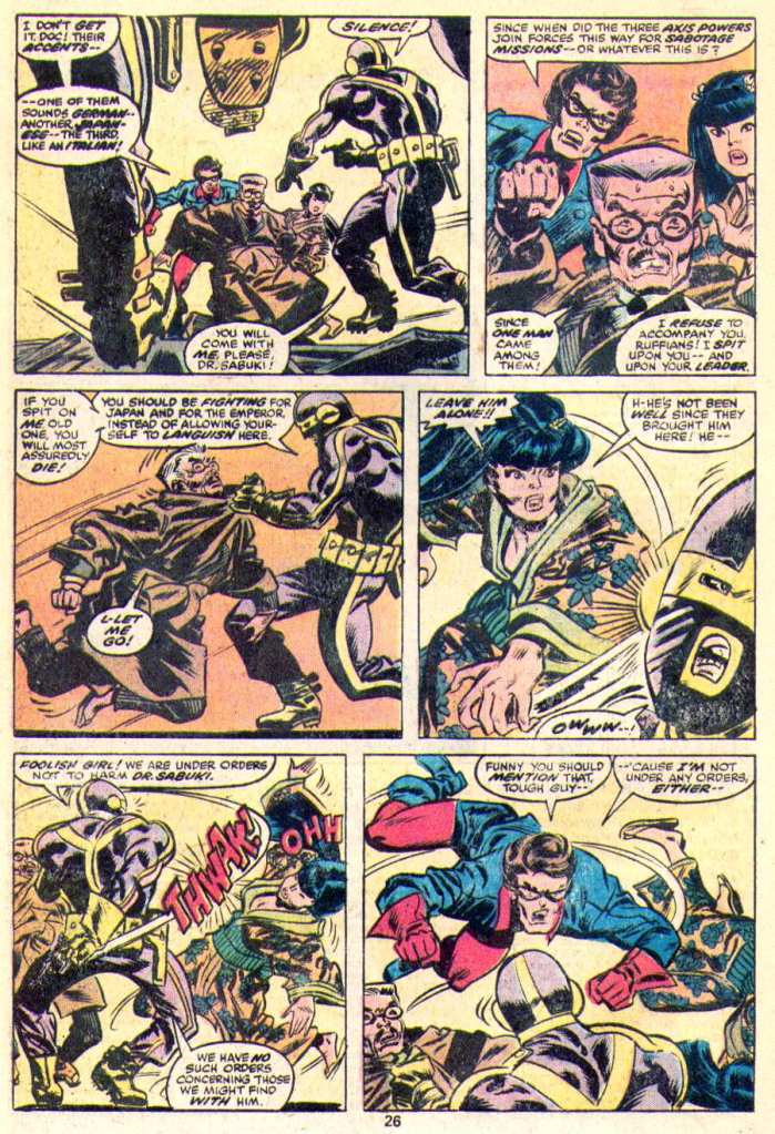 Bucky puts up a good fight, but he’s unprepared for the villain behind this attack: Agent Axis! Agent Axis has an interesting backstory. Originally, the character was created by Joe Simon and Jack Kirby in their BOY COMMANDOS series for DC. Decades later, while drawing a CAPTAIN AMERICA story that had Cap reliving events from WWII, Kirby had a brain-fart and included Agent Axis as one of Cap’s old foes. Not one to rest on such an opportunity, Roy eventually introduced this Marvel Agent Axis in the pages of INVADERS–he was a trio of enemy operatives–one German, one Italian and one Japanese==whom an accident had merged into a single being. His hope here is that Dr. Sabuki might be able to reverse this process and liberate his assorted selves, and so having clobbered Bucky, Agent Axis and his men make off with Dr Sabuki, Gwenny Lou and the kid as well–leaving Toro still at death’s door (which, in fairness, he’s been at since around issue #20 or so…) To Be Continued!