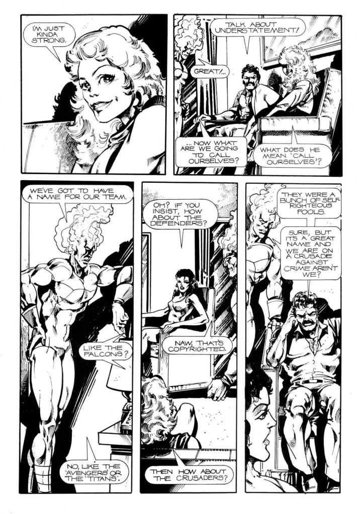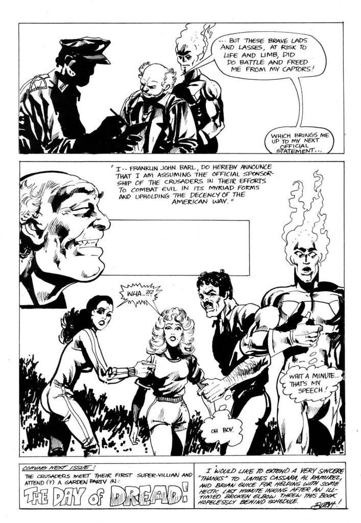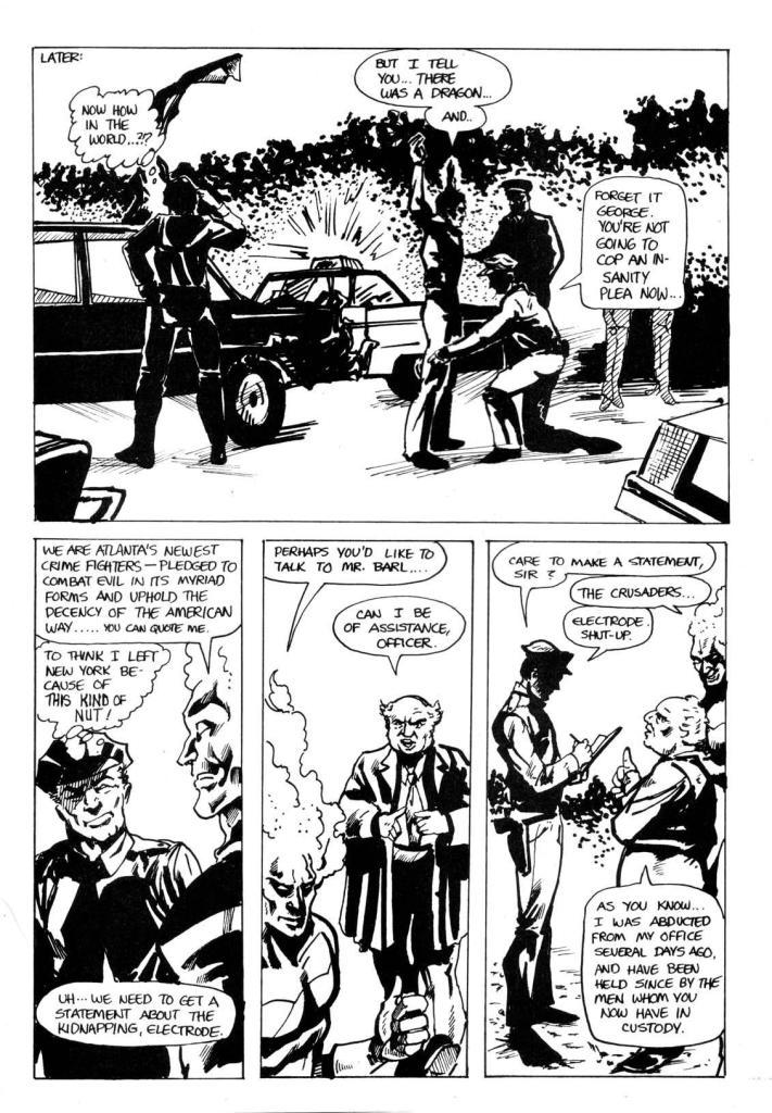 Unfortunately for The Guild, the trio of friends who had put together and published THE CRUSADERS #1, Archie Comics was right on the cusp of attempting to relaunch its super hero line one more time, under the Red Circle banner. They sent the Guild a cease and desist letter claiming that the title represented an infringement on THE MIGHTY CRUSADERS, which was then coming back into print. With no case, the Guild changed the name of their series to THE SOUTHERN KNIGHTS–and even reflected the C & D in the story, where the new super-team is similarly forced to change its name due to rights held by another publisher.
