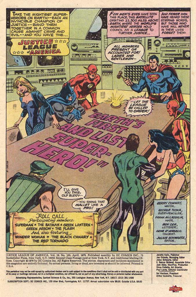 The year 1977 had given way to 1978, and in the first days of the new month, the mailman arrived with another subscription copy of JUSTICE LEAGUE OF AMERICA for me. I would end up with two copies of this issue–a few weeks later I’d be having a birthday, and as a gift my friend Don Sims bought me a stack of new comics, including this one. And if you want to read it but have never gotten a chance, DC just reprinted it this past week in a new JLA collection devoted to the wedding of Jean Loring and the Atom. It’s got another cover that’s a little bit rough–Rich Buckler was a good, contemporary choice for a cover artist during these days, but here inker Jack Abel does him no great favors. In particular, Batman’s face seems oddly pinched. This was a recurring situation with JLA (and many of the other DC super hero titles) at this time.