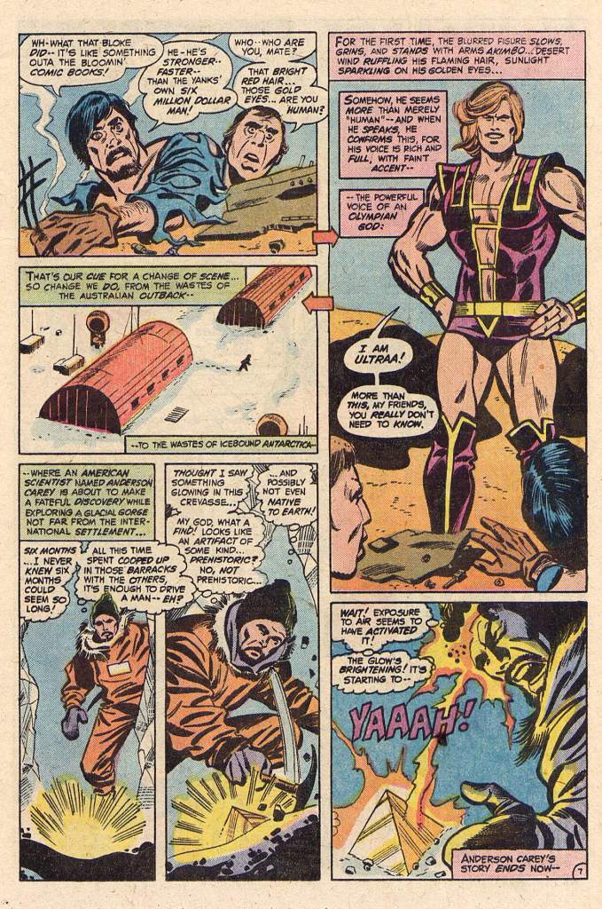 The story opens with the League in session, and arguing (at Green Arrow’s instigation) over how they should best be using their awesome powers to benefit mankind. Suddenly, five of the Leaguers begin vibrating uncontrollably, and they find themselves crossing the dimensional divide, winding up in outer space above the Earth (well, an Earth) . Green Lantern’s power ring is able to protect them from the void of space, but they’re not certain what’s just happened. Meanwhile, in the Australian outback, a superhuman figure calling himself Ultraa comes to the aid of some kangaroos being hunted by poachers. Ultraa’s got the sort of ill-considered costume design that a lot of the random DC villains and anti-heroes sported–it’s not a good look at all, open-purple shirt with thigh-high boots and shorts. Also, in Antarctica, a survey team unearths a strange otherworldly object which proceeds to zap them.