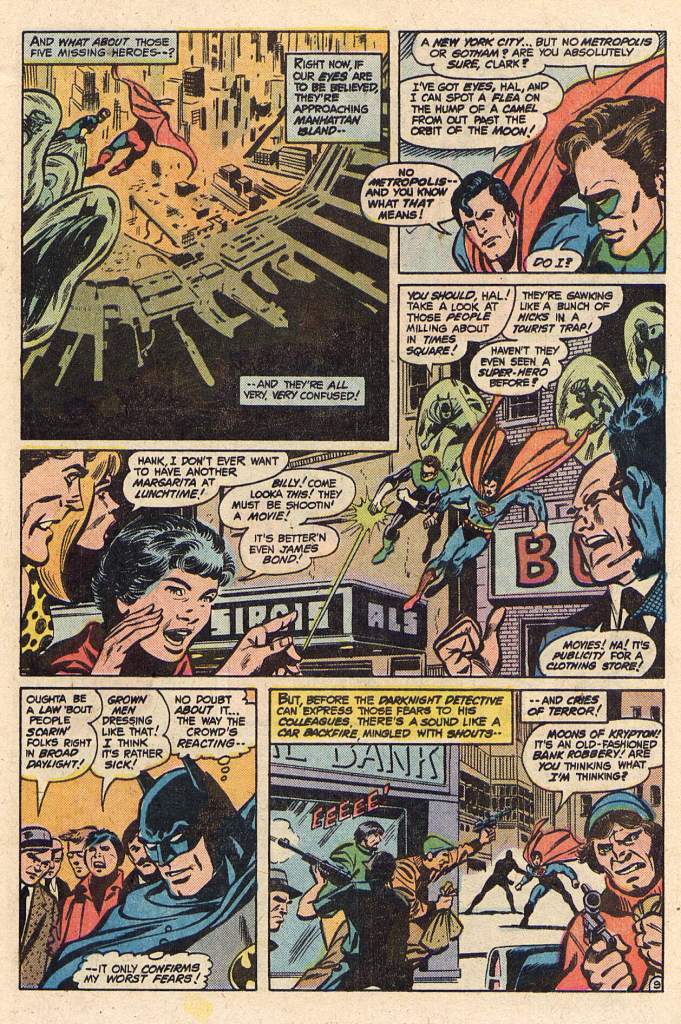Meanwhile, the League has used Green Lantern’s power ring to track down the source of what is keeping them on Earth-Prime–Ultraa himself. Superman and Green lantern take off to investigate, leaving Batman, Flash and Green Arrow behind for no good reason. Well, there is one good reason–it’s time for a fight scene! And so Maxitron attacks the three lesser-powered Leaguers, and they fight for a half-dozen pages, with the people of Manhattan more panic-stricken than usual as the denizens of Earth-Prime aren’t used to being front and center in the midst of these superhuman battles. Ultimately, Maxitron winds up clobbering the three Leaguers, then turning is attention to Superman and Green Lantern, as well as Ultraa.