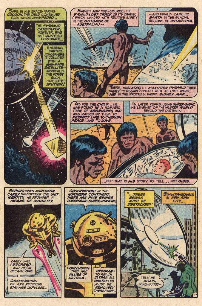 Elsewhere, the researcher zapped by the alien pyramid device has been transformed into Maxitron, and we learn te origin of both he and Ultraa. They were the survivors of a doomed planet entrusted to a cosmic ark to take them to a new world. But the Ark was damaged in flight, and Ultraa was jettisoned to Earth for safety, along with the pyramid gizmo to serve as his teacher and protector. But the pyramid was deflected to Antarctica due to a collision with an Earth satellite, and so Ultraa ended up raised by aborigines in Australia. Trapped in Antarctica and unable to fulfill its purpose without mobility, the Maxitron pyramid slowly went insane–and now it seeks to destroy Ultraa as well as the other superhumans it detects on Earth, the Justice League.