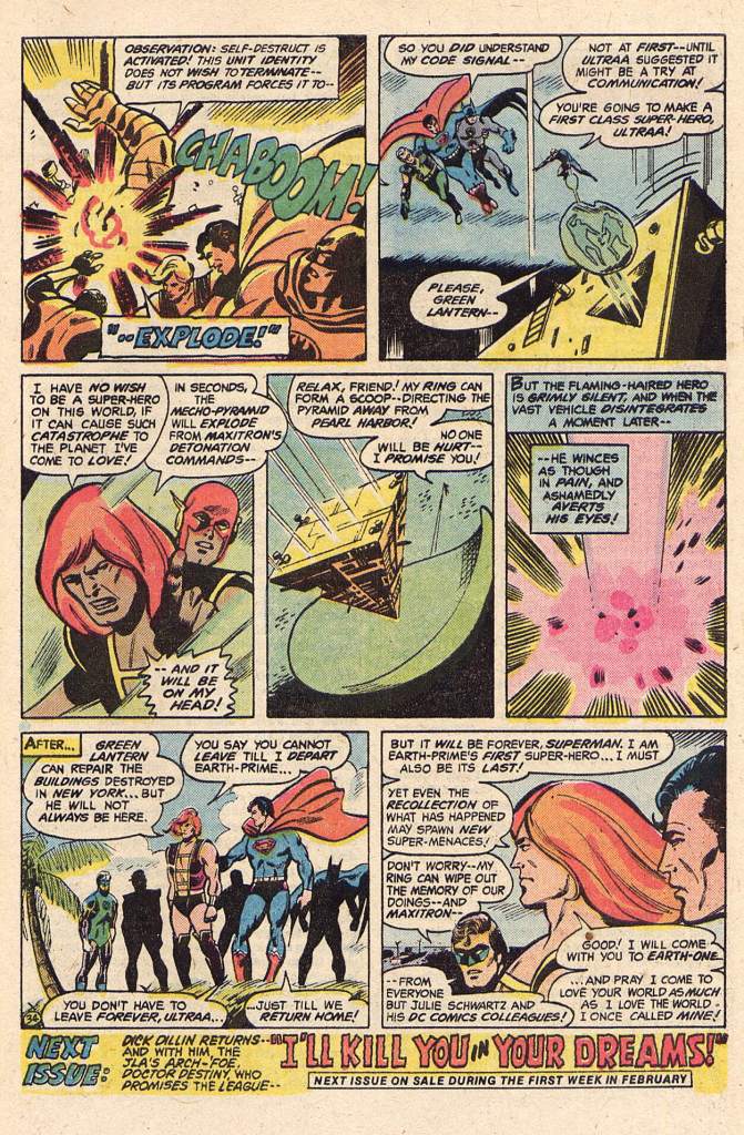 Elsewhere, Ultraa is running across the ocean for some reason when he’s attacked by incredulous American fighter pilots. He retaliates in kind just as Superman and Green Lantern arrive, thus making himself look like a bad guy long enough for them all to have a fight. Eventually, sanity prevails, but Ultraa has the outlook that superhumans like himself don’t belong on tis world–which is good news for the JLA, as they need Ultraa to leave with them if they’re going to get back to Earth-One. They theorize that Ultraa, like Superman, will eventually draw out other super heroes and villains–and it’s this attraction that’s keeping the League stuck on Earth-Prime. But before everybody can leave, Maxitron shows up in a huge Pyramid ship and demands Ultraa and the rest of the League surrender to him.