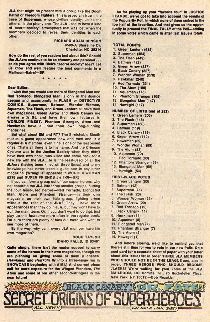 And since it played a direct role in the preceding story, here are the results of Julie Schwartz’s JLA popularity poll, from the second page of the JLA Mail Room feature in this issue. Seems like nobody loves Hawkgirl.