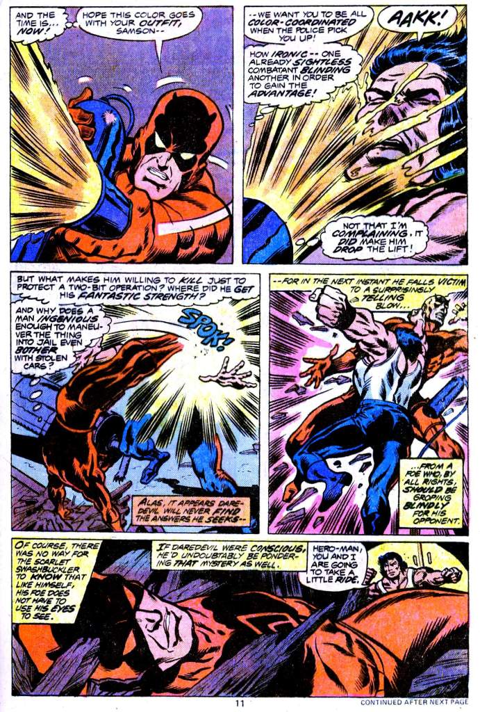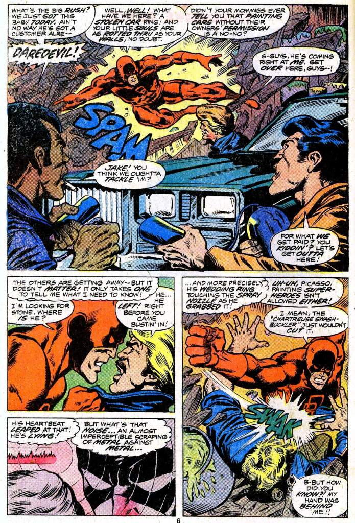 But Stone himself is another matter. When the sightless adventurer eventually smokes him out, Stone attacks him–and evidences strength far in excess of an ordinary human being. DD gives a good accounting of himself, but he’s eventually trounced by Stone, who sticks the Man Without Fear in a car and then drives it off a pier. But Daredevil is old hat at escaping from this sort of a predicament, and he’s able to kick out a window in the submerged vehicle and swim to safety.