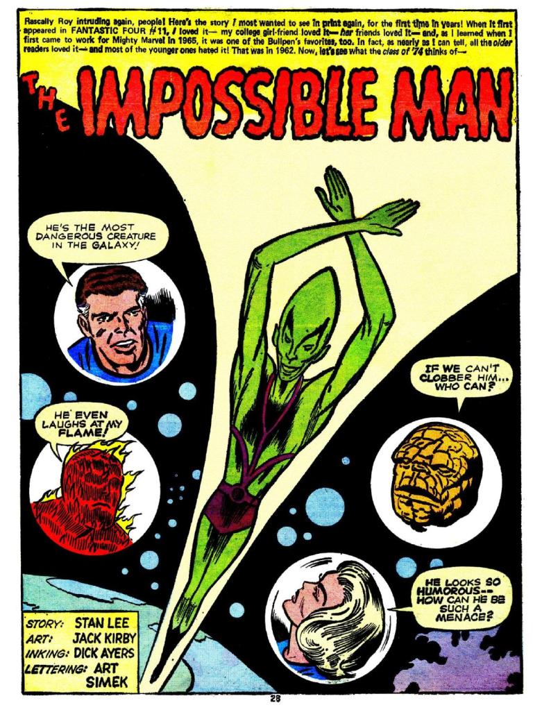 Next reprinted was the two stories that had seen print in FANTASTIC FOUR #11, though editor Roy Thomas here switches the order of them, leading off with the introduction of the Impossible Man. Roy had a real soft spot for the Impossible Man based on having read this story as a reader, and even brought him back somewhat over publisher Stan Lee’s objections (Stan recalled all of the negative fan mail they’d received when this issue first came out.) It’s a relatively absurd story, very much in the mold of something that might have seen print in Simon & Kirby’s FIGHTING AMERICAN. I didn’t hate it, but neither did I love it.