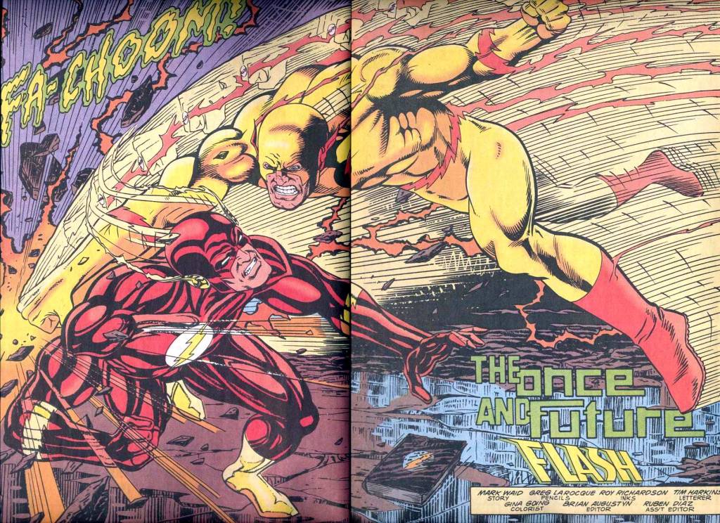 It is also HUGE, a triple-sized issue, all illustrated by regular artist Greg LaRocque, in what would be his swansong after five years on the title. LaRocque was sort of the 90s-modern equivalent of artists such as Dick Dillin or Irv Novick–dependable and reliable, but not spectacular, not the sorts of artists who get fans buzzing. But here, on is final Flash outing, he really brings his A-game.
