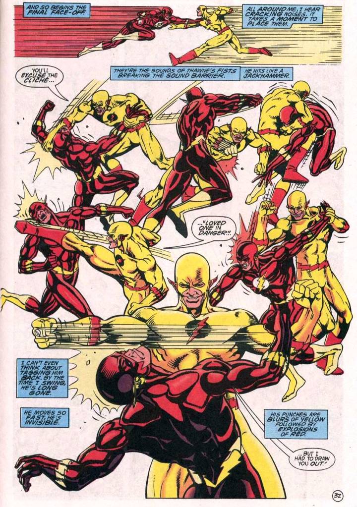 From this point on, it’s game over. The Flash has taken his lumps and proven his endurance–now he gets to unload on Thawne both physically and emotionally, and it’s incredibly satisfying. Knowing that they need to maintain the timeline, Wally lures Thawne to the cosmic treadmill and tricks him into using it to return to his native 25th century–where he won’t remember ever having battled Wally West and where his future as Barry Allen’s ultimate nemesis is still waiting for him.