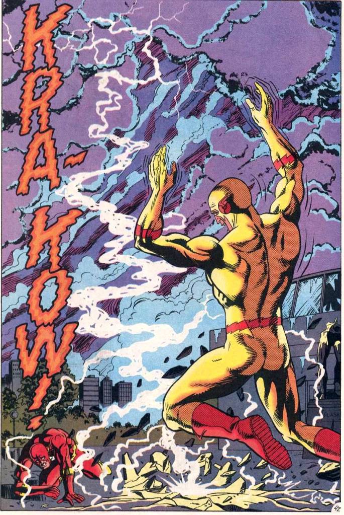 Over the preceding number of issues, Barry Allen had turned up again, alive–the prevailing theory seemed to be that his molecules had been shunted to this time during his suicide run against the Anti-Monitor during CRISIS. But he was back, and as heroic as ever–leaving Wally West, who was still suffering from limitations on his speed, feeling out of sorts and unneeded. Things reach a head when Barry appears to snap, going full rogue–and while Green Lantern, original Flash Jay Garrick, Johnny Quick and new vintage speedster Max Mercury (a character based on Quality Comics’ Quicksilver, but renamed to avoid confusion with the Marvel hero) battle him in the streets, to no avail, a despondent Wally comes across a burned and tattered book in the alleyway where Barry Allen reappeared–a book which reveals his true identity as Eobard Thawne, Professor Zoom, the Reverse-Flash, the only foe Barry had ever killed. So how can he still be alive and taking Barry’s place?