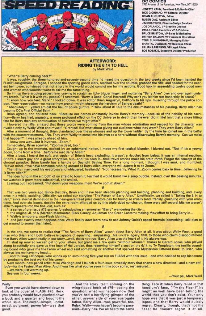 We’ll end here with Waid’s own letters page summation of the storyline he’d just concluded. But this is, in my opinion, the finest single issue of FLASH every produced in the character’s 80 year history.