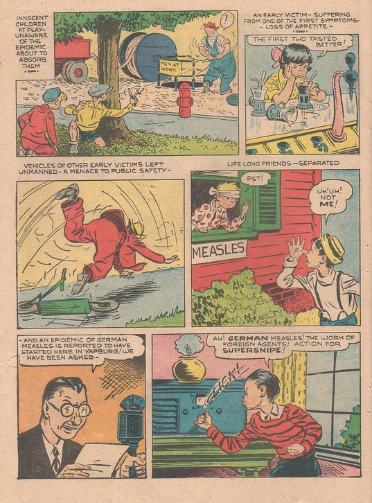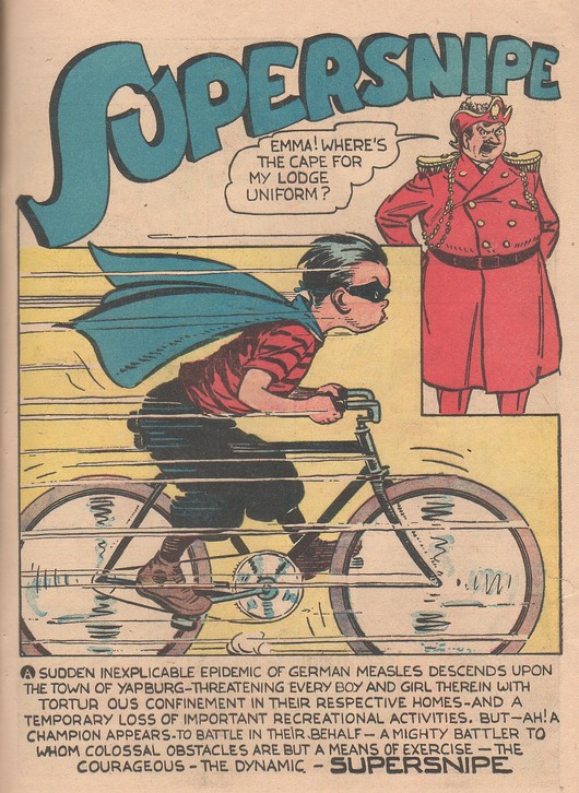 Supersnipe’s creator George Marcoux reportedly got the idea for the character on the street one day: he spied a child with a homemade cape tied around his neck racing through the streets on his bicycle. A woman almost collided with the cyclist, and called out, “Guttersnipe!” Marcoux reportedly corrected the woman: “No, ma’am. That’s Supersnipe!” And the series was born.