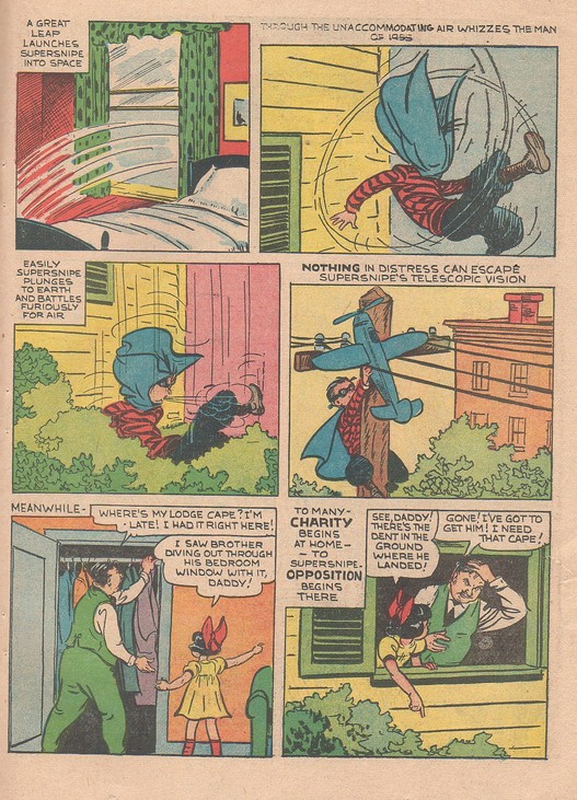While all of the particulars hadn’t been worked out for this first installment, Supersnipe was really young Koppy McFad, the boy with the most comic books in America. Koppy would routinely alternate between daydreaming about his fantastical adventures as Supersnipe and swiping his father’s lodge cape and long-johns to prowl the streets of his small town, looking for adventure.