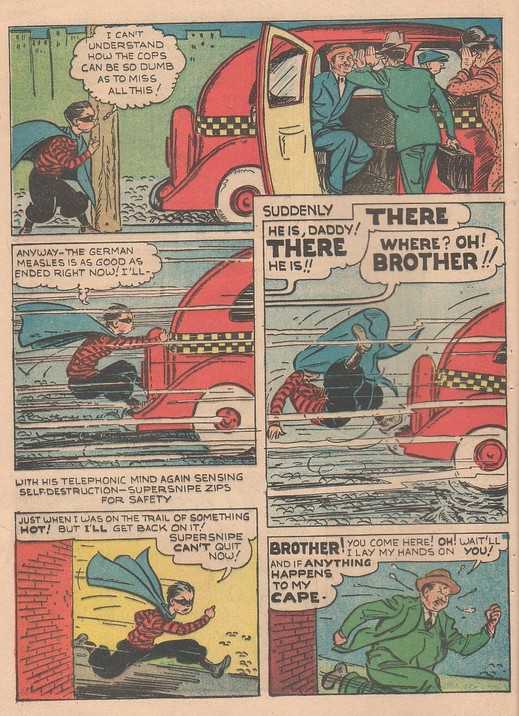 Among the mostly-forgotten series of the Golden Age of Comics, there are a few which self-reflexively turned their gaze on the comic book industry itself, and what effect it might be having on its youthful readers. Perhaps the best-remembered of these was Supersnipe, a character who made his debut in Volume 2 #3 of Street & Smith’s SHADOW COMICS (which was primarily devoted to stories of the pulp crimefighter) before eventually headlining a series of his own. Supersnipe was a pretty charming feature overall.
