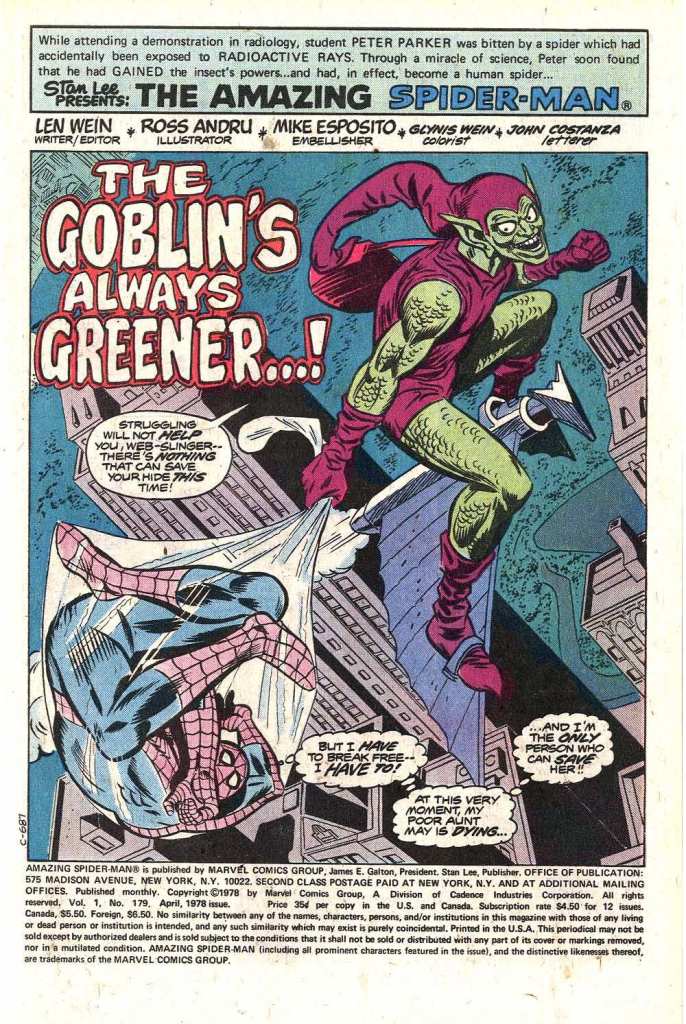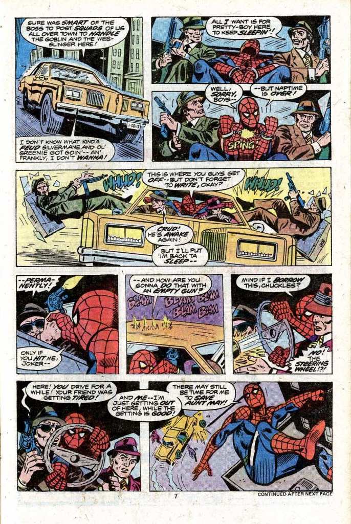 This issue was part four of a five-part saga written by Len Wein which squeezed Spidey in-between the Maggia forces commanded by Silvermane and the Green Goblin. It was essentially Len’s remix of the two-part Lee/Ditko Goblin/Crime-Master story from the early days, expanded and modernized. The issue opens with the Goblin having captured Spidey, who desperately needs to get to the hospital to okay Aunt May’s surgery. But the Goblin is attacked in midair by some of Silvermane’s goons, and Spidey falls into a convenient dumpster. The gunsels carry him out, intending to take him to their boss, but Spidey breaks free and clobbers them. He then swings off towards Aunt May.