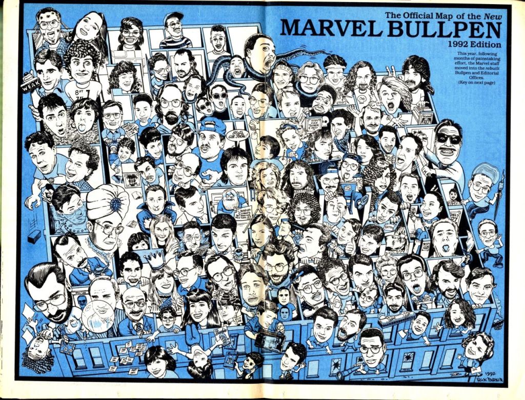 To give you some idea of the geography we’re talking about in this series, here’s an illustration produced by the selfsame Rick Parker for MARVEL AGE in 1992, depicting the then-Bullpen office space and players. This is the same building–387 Park Avenue South, 10th Floor–that my internship was served in, though the floor was refurbished and restructured just before this picture was done, so as to create more office space for everybody.