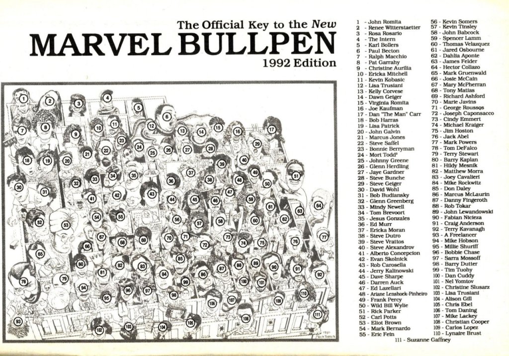 Of all the people included in this image, fifteen years later only Ralph Macchio, Dan Carr and myself are still on staff, and only a couple of other people–Tom DeFalco, Dave Sharpe, Fabian Nicieza–still do any sort of regular work for Marvel.