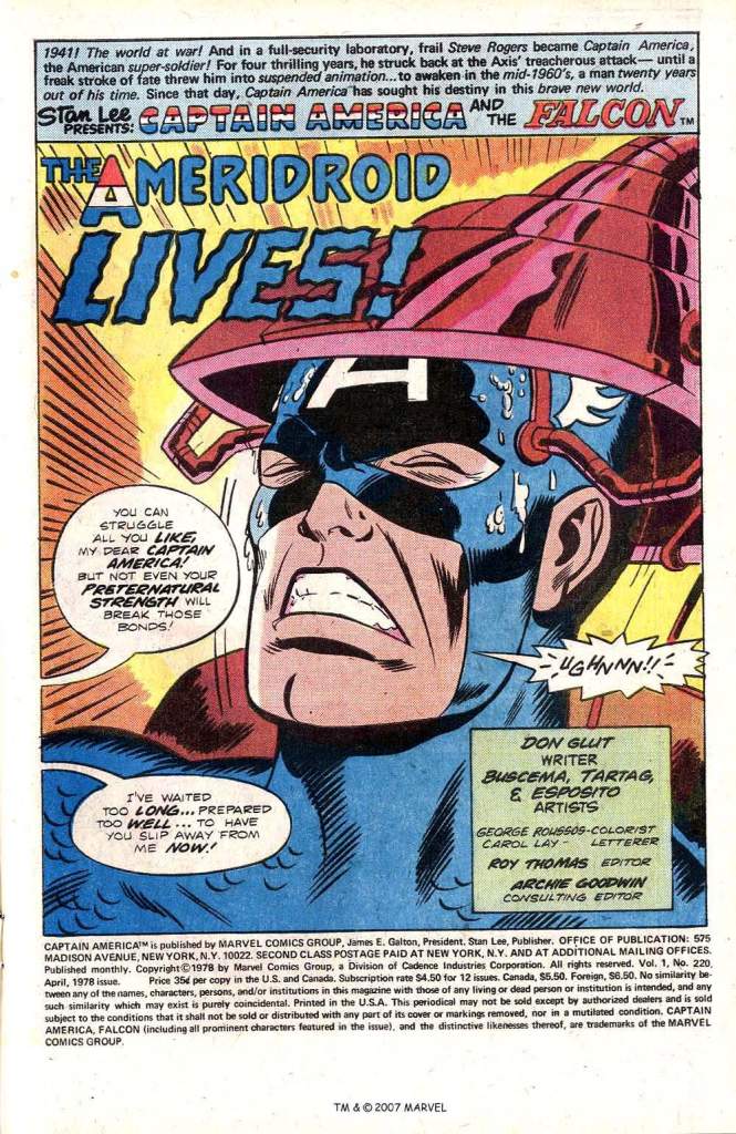 Back in the present, Dekker has grown too old to survive his original Cap-physique-stealing process–which is why he’s built his super-large Cap android. His plan has been amended: he’s going to suck Cap’s power into the ‘bot and put his own mind into it as well. And e proceeds to do just that! And then, abruptly, the story comes to a sudden To Be Continued because the creative team ran out of time and didn’t finish their pages in time. Oops! Well, at least it’s not the most horrible place to put a break in the story, given that Dekker has just become the Ameridroid–that almost feels like a climax moment. Still, it’s another example of the sort of shoddiness that ran rampant at Marvel in this era, as the workload had grown beyond the capabilities of any single editor to handle.