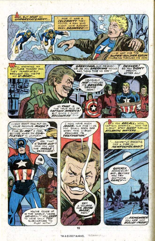 For really no reason tan to give an excuse for recounting this missing chapter of Cap’s life, Dekker tells his foe how the Red Skull first saved him from their previous encounter but then turned on him for his failure. Dekker managed to survive and he wound up in Newfoundland, where he recruited a new cadre of henchmen. And so, when he heard about Cap’s final battle with Baron Zemo, Dekker sent scuba divers to fish Cap’s frozen form out of the water and bring it to him in Newfoundland–where Cap revived. Not even thinking about Bucky once in this flashback adventure (which seems absurd given how the present day Cap would wax rhapsodic about his dead partner at the drop of a hat) Cap learns that Dekker has developed both a new type of nerve gas and also an apparatus which can drain Cap’s superhuman physique and impart it to Dekker. Pretty good work from a guy who was doing movie special effects just an issue ago.