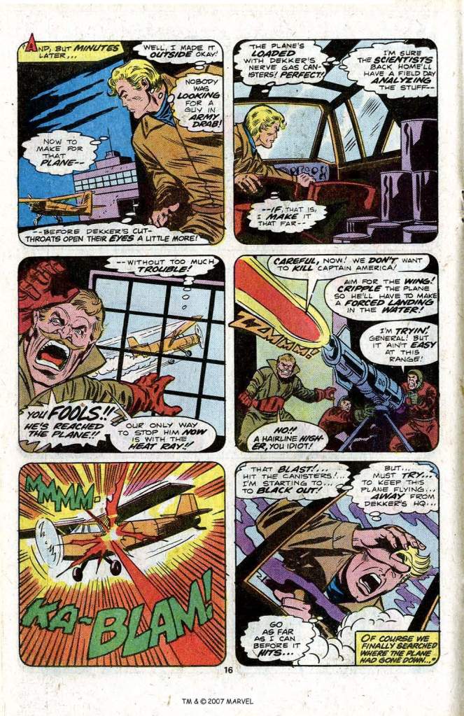 Cap takes the opportunity to break free and fight his way through Dekker’s stronghold. He also switches back to his Steve Rogers duds because continuity shows that when he’s unfrozen by the Avengers, he’ll be wearing them. So even though it doesn’t really make much sense, he makes the change, then heads for the plane full of Dekker’s experimental nerve gas. Of course, Dekker’s men shoot the plane out of the sky–and now we learn that it was actually this Nerve Gas combined with Cap’s super-soldier serum that threw the Avenger into suspended animation. Thus, what was once a simple if implausible story has been replaced by something complicated but equally implausible (if not more so.) Te net gain here, frankly, is less than zero. Still, a lot of Marvel comics of this era put a lot of effort into tidying up little quirks of continuity like this one, whether justified or not.