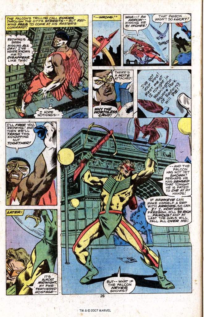 The perpetrator is a guy named Mortimer Freebish, who fancies himself a villainous Hawkeye. Special note must be made of Freebish’s costume, which is aggressively awful–by intent, I would hope since the character is intended to be something of a nut. It takes the Falcon four more pages to beat this guy into the dirt, but the story is entertaining enough, if a bit overtly silly. And it does nothing to enhance the Falcon’s reputation as a solo hero–something sorely needed at this point, as he would be dropped from the masthead in another issue or two and relegated to infrequent guest-star.