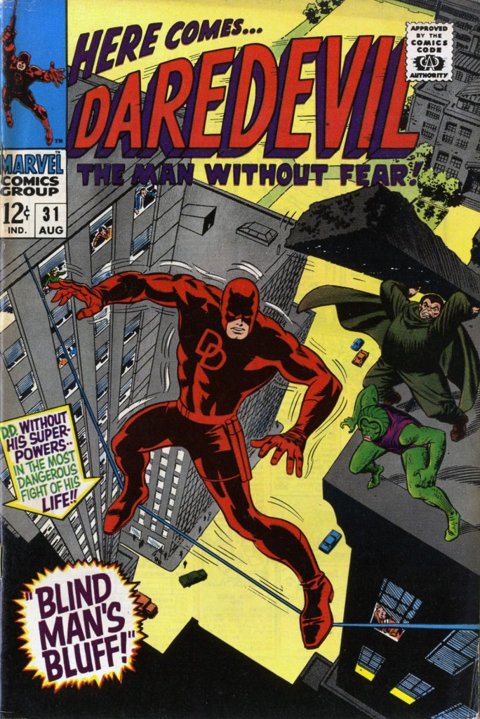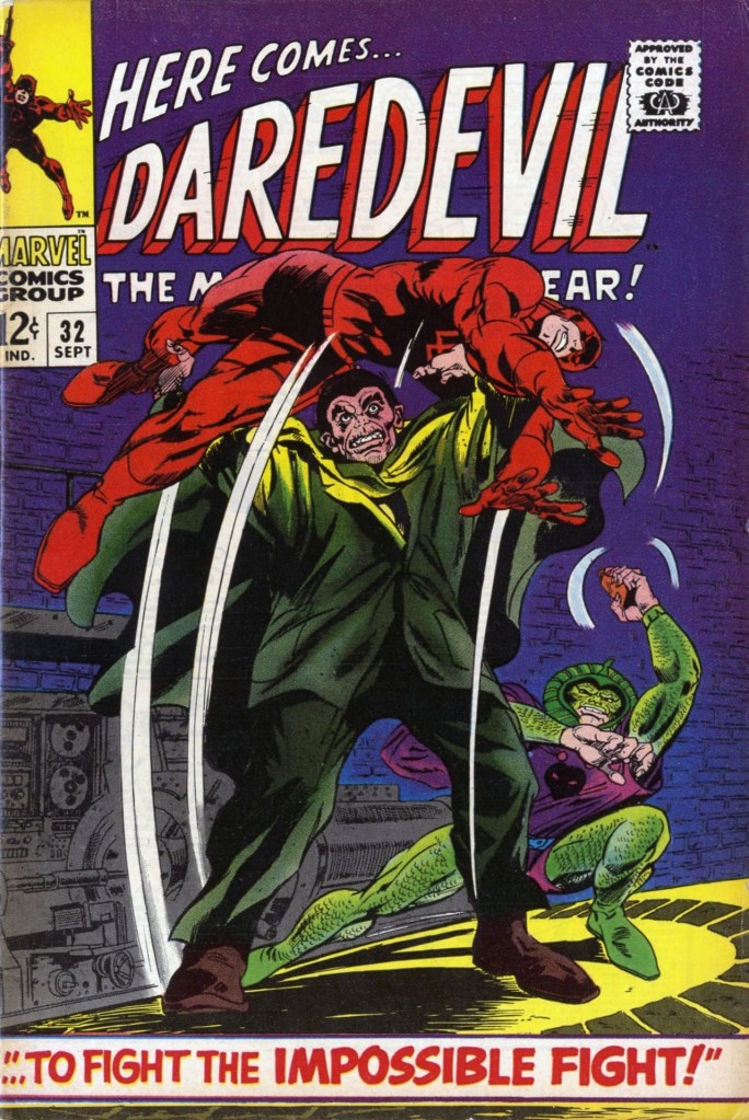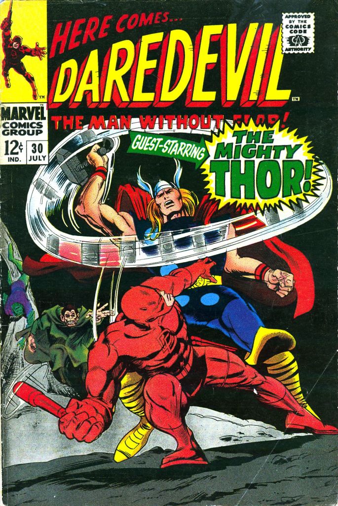 Also, at the time I rather liked how foes of more powerful characters would be recycled against the much-more-human-scale Daredevil. The antagonists weren’t scaled down when facing Daredevil, so it was always an interesting story of how that hero rose to the occasion. This was a formula that proved sure-fire when Daredevil got involved with the FF against Doom, thanks to Kirby and Lee.