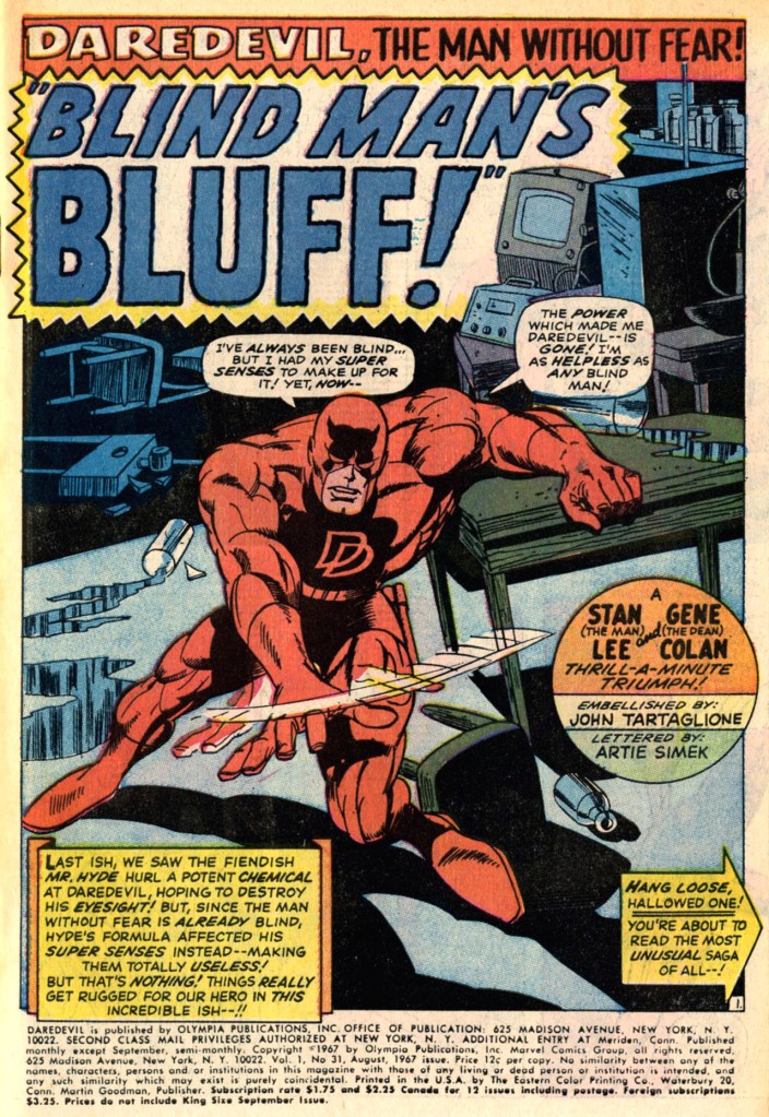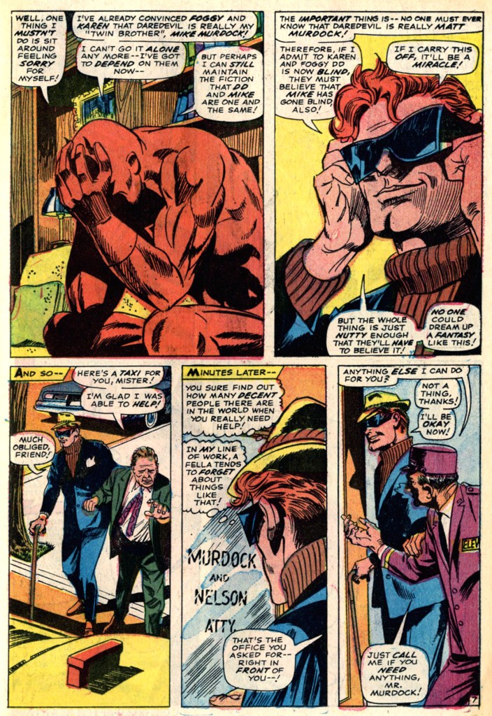 Now, if you were Daredevil, at this point you might choose to consult with a doctor, to see if there was any way your condition might be reversed. Or a scientist for that matter, someone like Matt Murdock’s client Reed Richards. But not our hero! Instead, he decides to head into the law office–but again, for no discernible reason, he chooses to go not as Matt Murdock, whom everybody knows is blind, but rather as Mike Murdock–who will need all sorts of crazy uncharacteristic assistance to get across town. These strike me as choices that Colan makes while he’s drawing the story and which Lee attempts to make plausible as he scripts it–but it really doesn’t work. Anyway, getting to the law office, Mike banters with Foggy and lets him know that, like his “brother” Matt, Mike/Daredevil is now also sightless.
